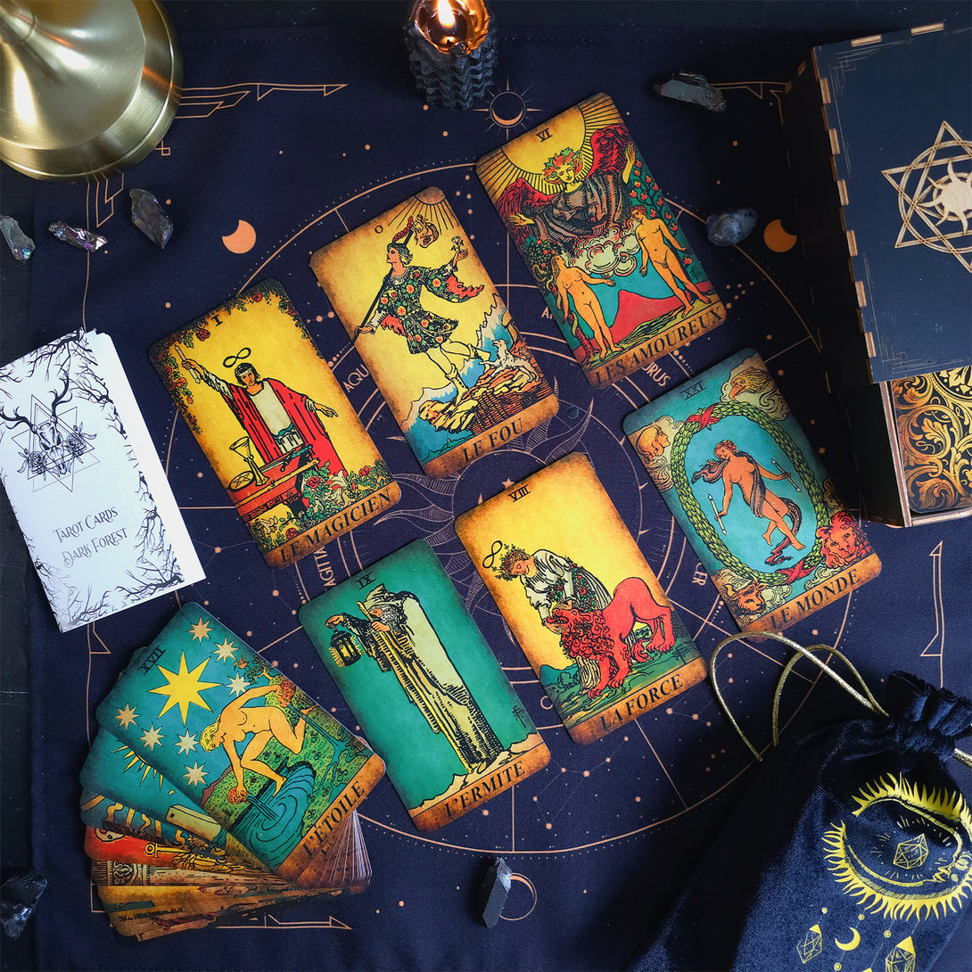 This set contains 78 borderless vintage tarot cards based on the classic Rider‑Waite system. The cards are printed on premium eco‑friendly linen cardstock with a protective laminated finish for durability. Each deck comes with a printed guidebook. Optional accessories may include a cloth bag or box. The deck is suitable for beginners as well as experienced readers.